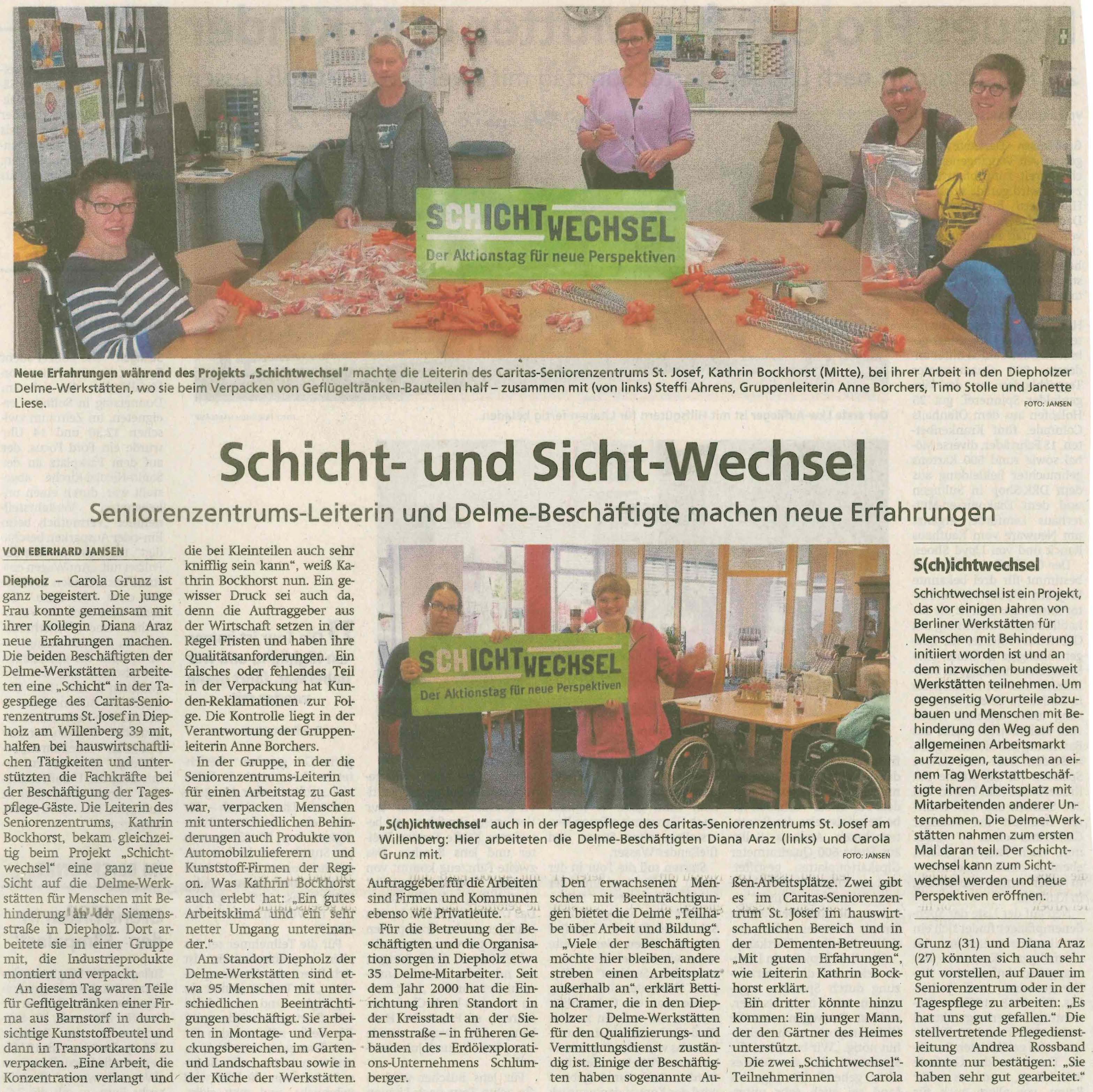 Die Sulinger Kreiszeitungberichtet über den den SCHICHTWECHSEL-Aktionstag in Diepholz. Es wurde zwischen der Werkstatt und einem Seniorenzentrum bzw. einer Tagespflege der Caritas getauscht.