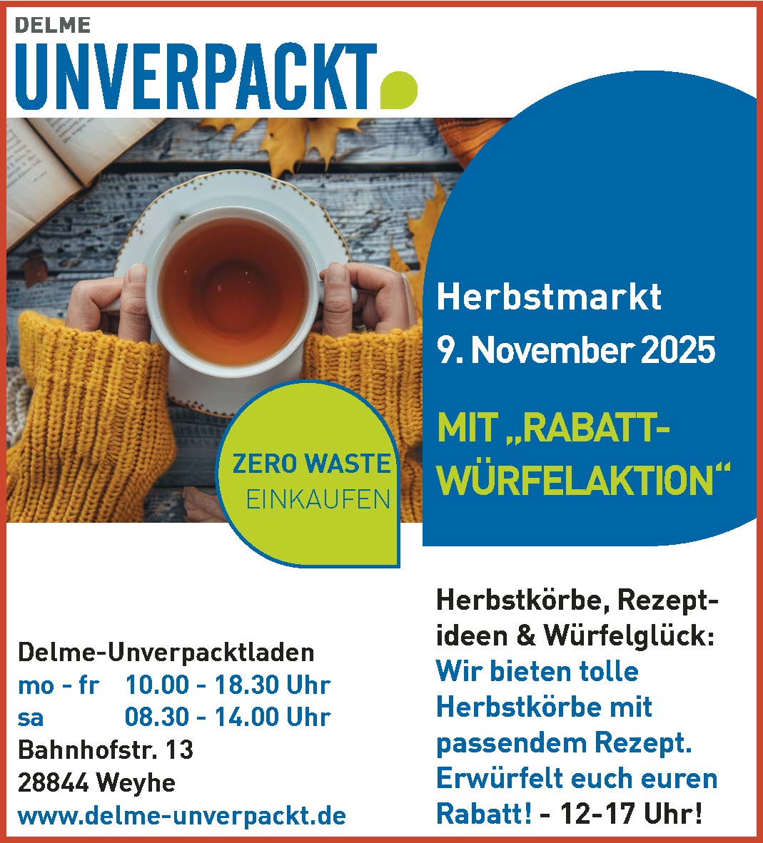 Am Sonntag, den 9. November 2025, freuen wir uns wieder beim Herbstmarkt in Weyhe teilzunehmen. Der Delme-Unverpacktladen und die weiteren Geschäfte laden zum Bummeln und Einkehren von 12.00 Uhr bis 17.00 Uhr entlang der Bahnhofstraße ein.