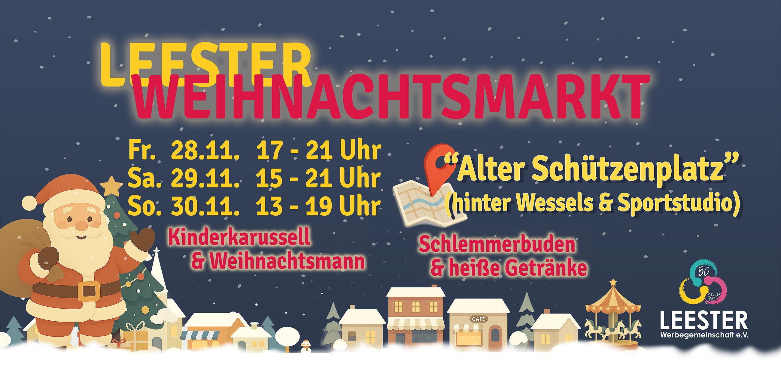 Der Leester Weihnachtsmarkt ist geöffnet am 28. November von 17-21 Uhr, am 29. November 2024 von 15-21 Uhr und am 30. November von 13-19 Uhr.