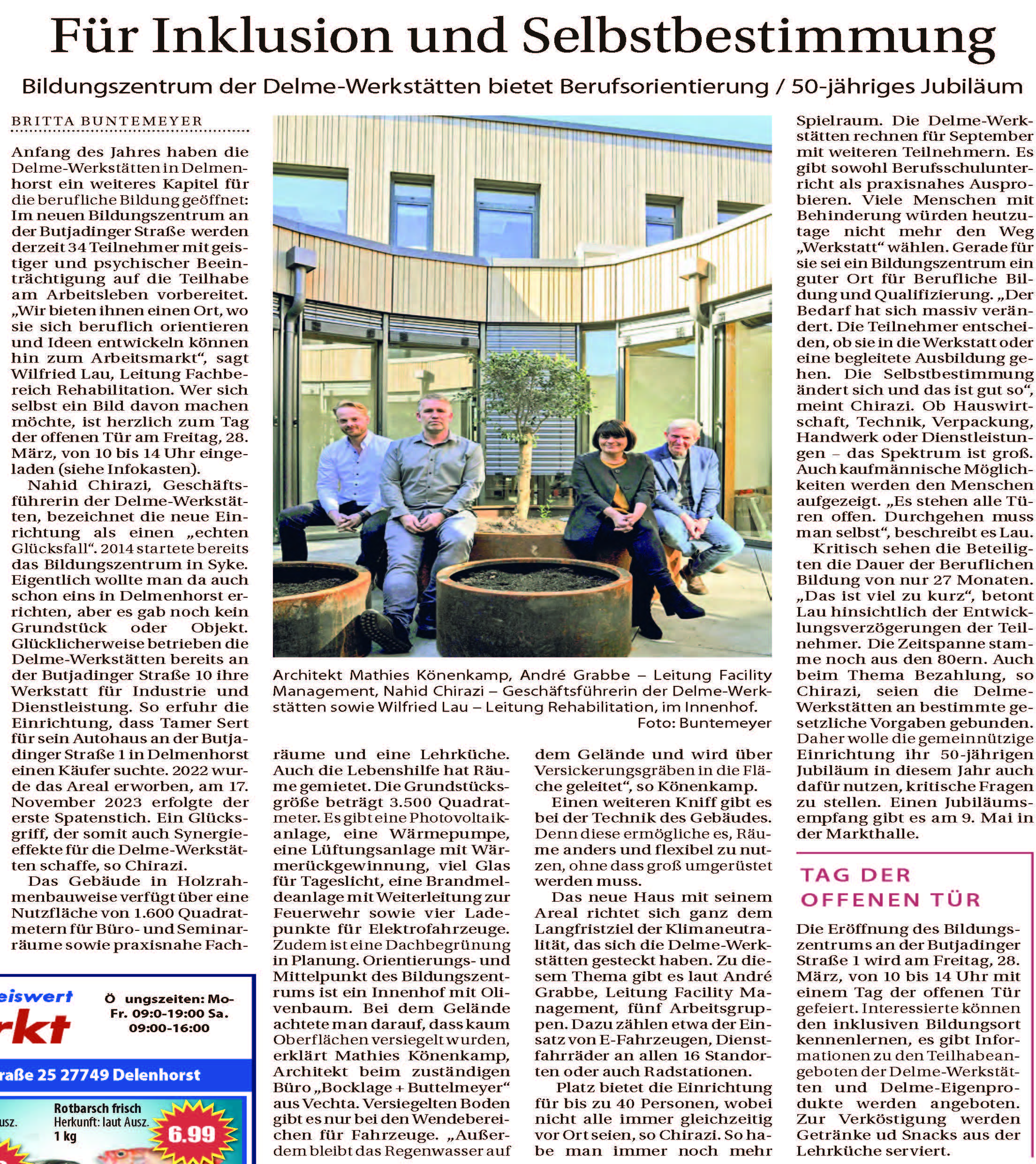 Auch Britta Buntemeyer vom Delme-Report berichtet über die Eröffnung des neuen Bildungszentrums in Delmenhorst in unserem Jubiläumsjahr 2025: