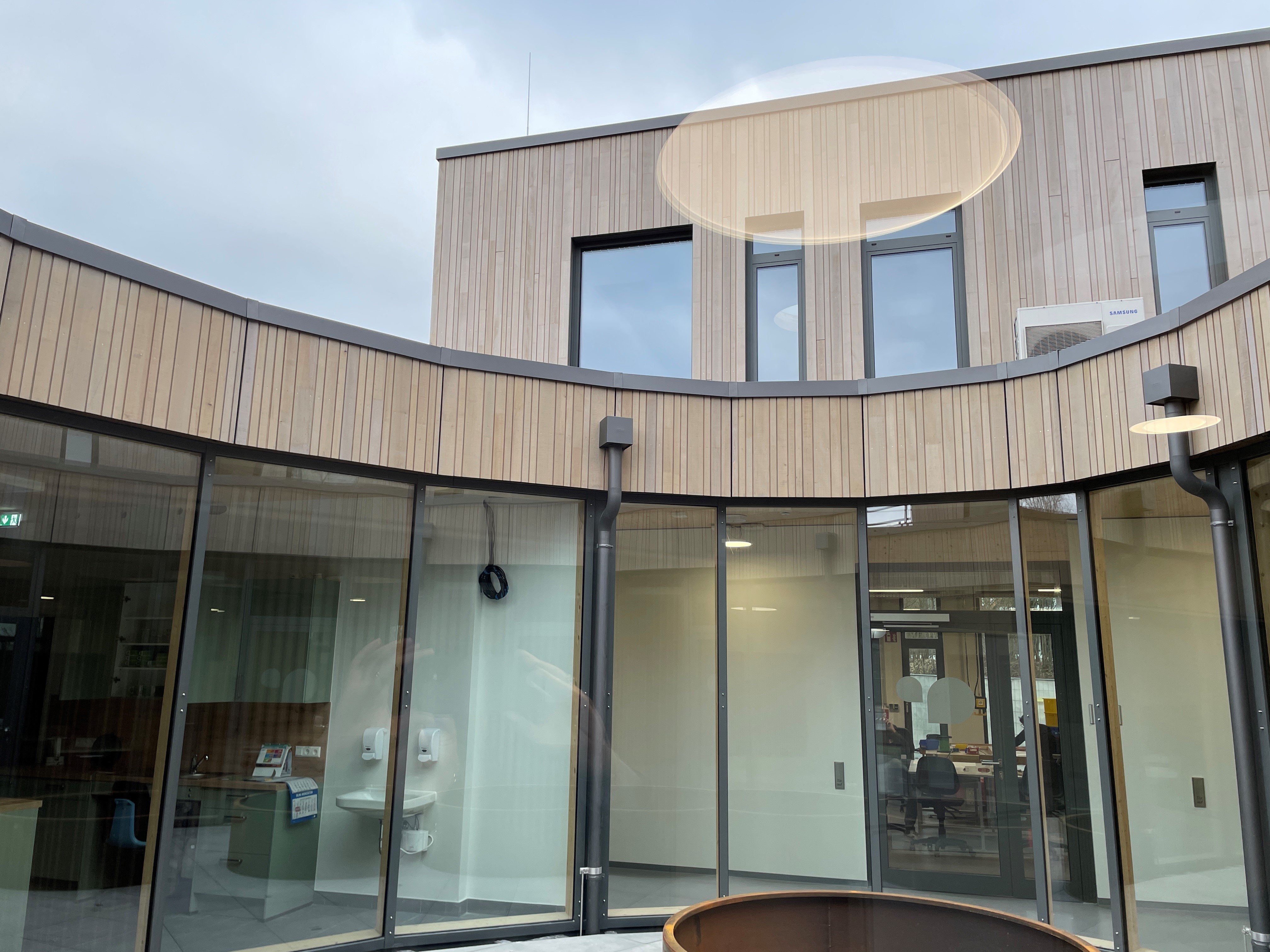 > Gang durch das Gebäude in Holzrahmenbauweise